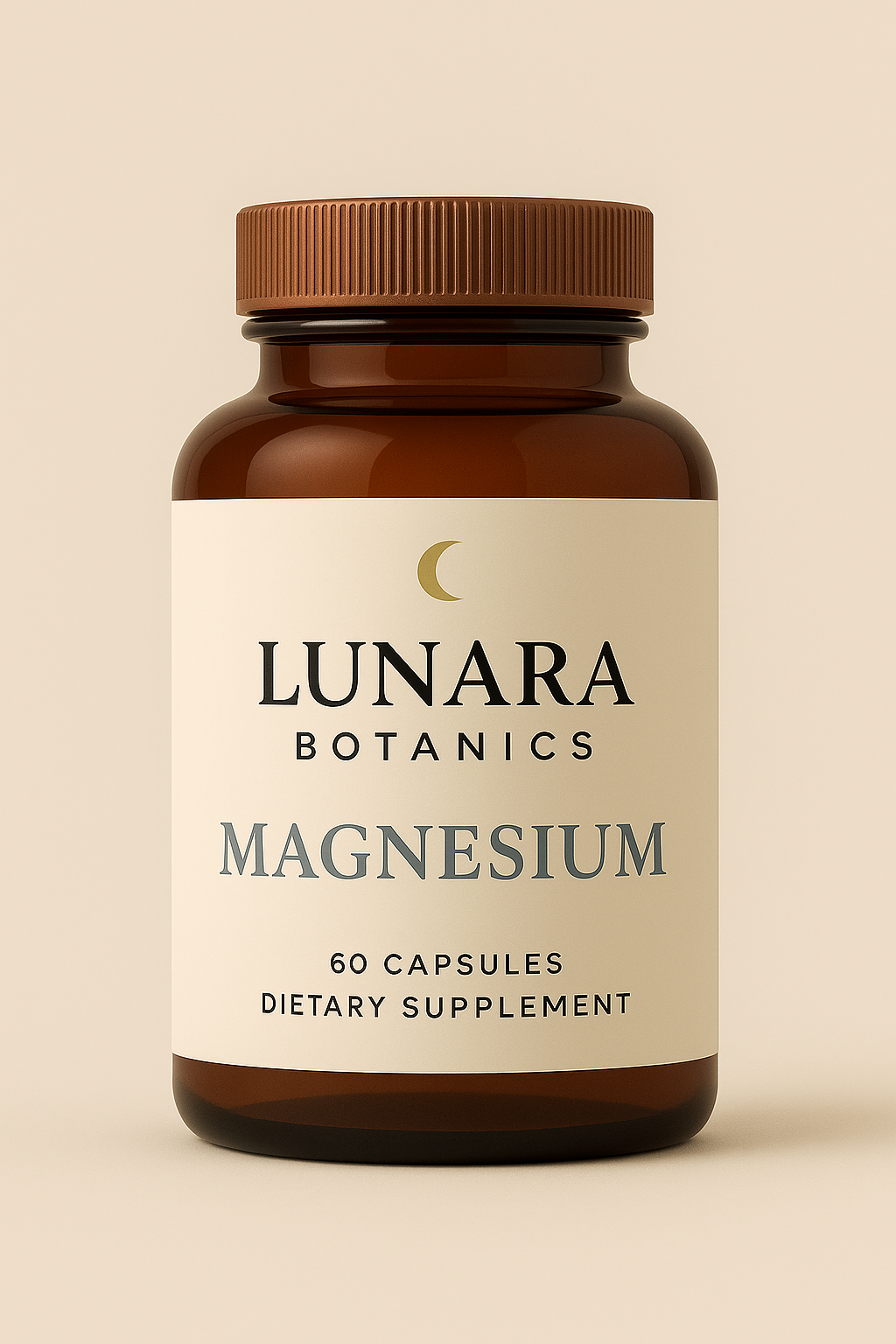 Lunara Botanics Magnesium is a premium, plant-friendly magnesium supplement designed to support relaxation, muscle function, and overall well-being. Magnesium plays a vital role in over 300 biochemical reactions in the body, helping to regulate muscle and nerve function, support energy production, and promote a calm, restful mind.